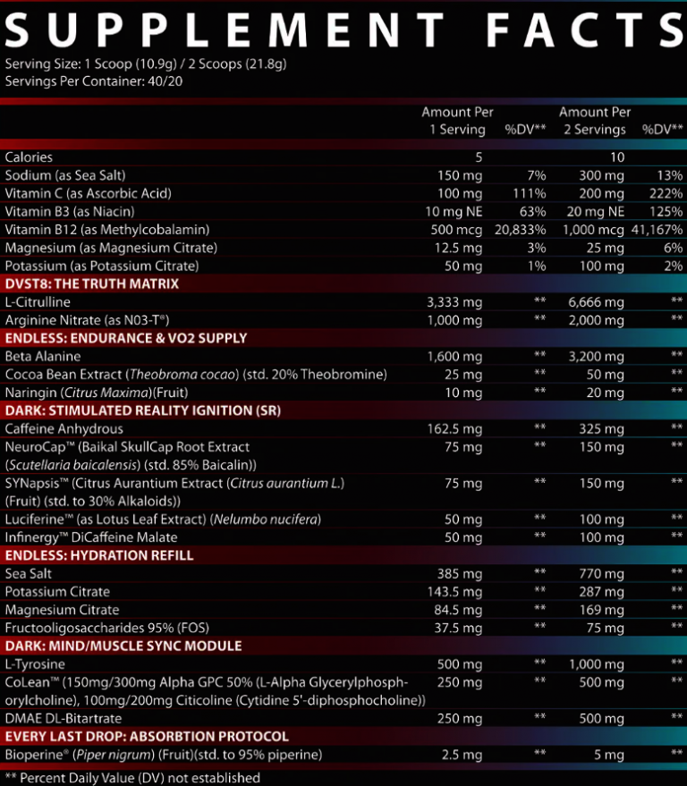 DVST8 Dark PWO создан для опытных атлетов, которые требуют от предтреника абсолютного максимума. Это мощная формула нового поколения, объединяющая сильную стимуляцию, глубокий ментальный фокус, выраженный памп и высокую выносливость. Каждая тренировка с DVST8 Dark превращается в интенсивный и контролируемый взрыв производительности.